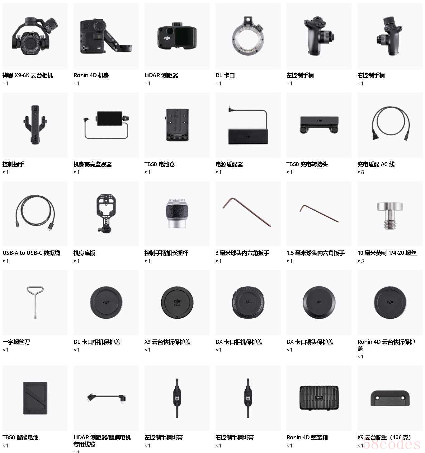 DJI Ronin 4D配备1080P 60Hz可翻转LCD屏幕,电池容量4280mAh,最大充电功率可达180W。该云台相机还支持LiDAR测距器、激光对焦、6公里无线图传等功能。DJI Ronin 4D-6K套装版所包含的配件如下图所示。