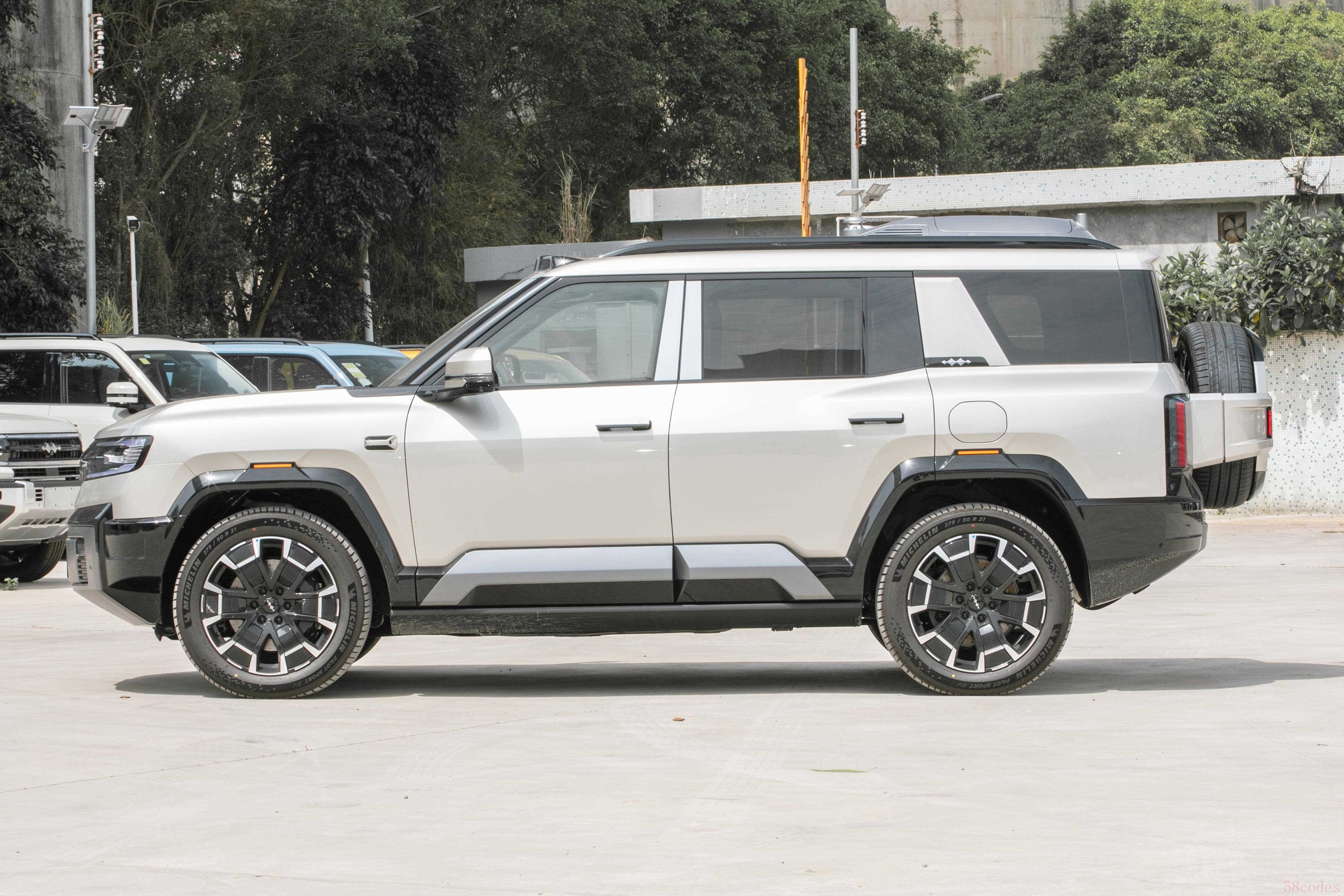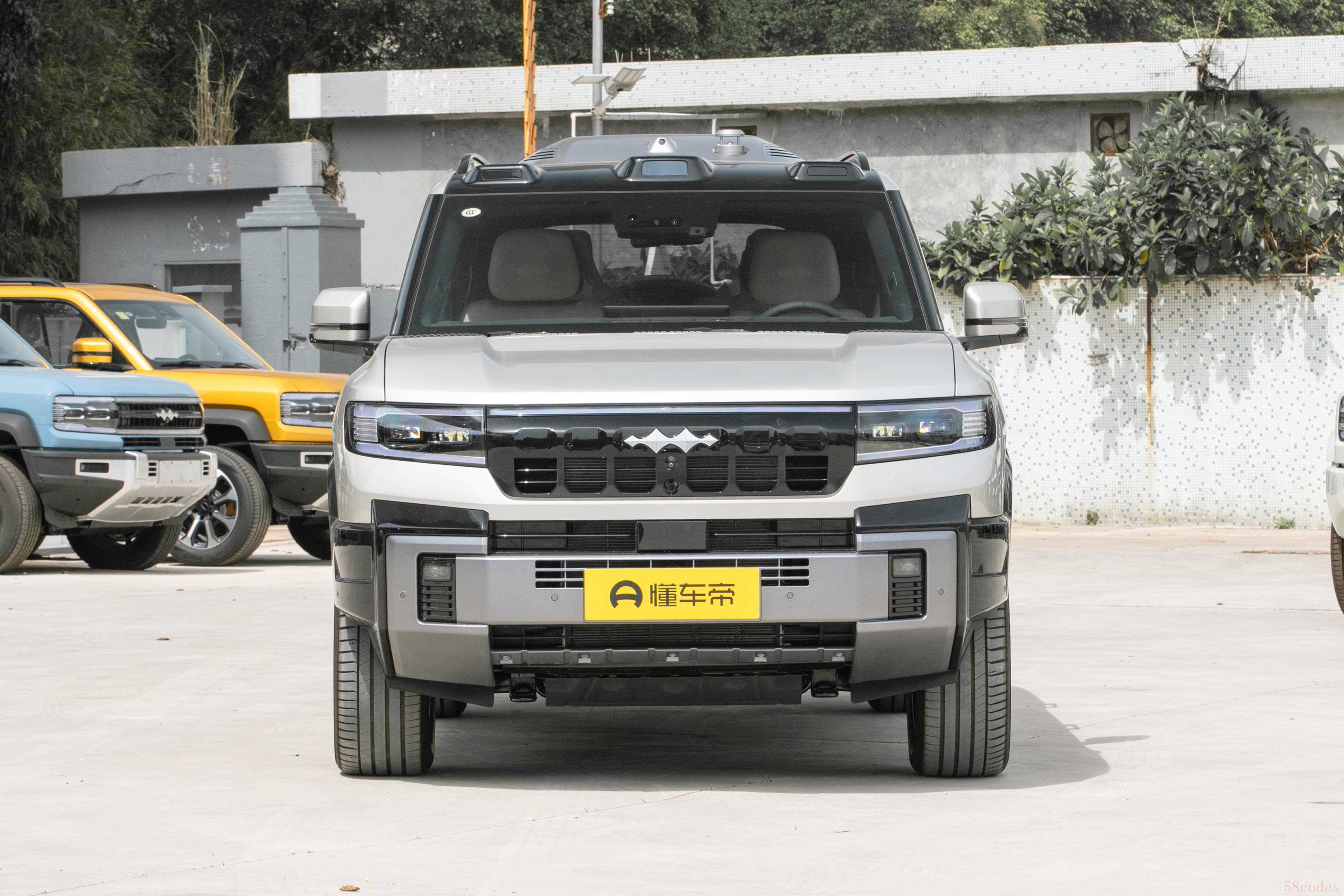 豹8前脸采用封闭式格栅设计,搭配贯穿式“星舰之翼”LED灯带,两侧C字形灯组与格栅融为一体,夜间点亮后辨识度较高。矩阵式大灯灯腔内部融入“豹爪”造型日行灯,支持自适应远近光切换,提升复杂路况照明能力。前包围处嵌入银色饰板,呈现机械锁扣造型,搭配深灰色护板,兼顾硬派风格与空气动力学优化。中网LOGO支持动态点亮功能,与灯带形成联动效果,强化品牌辨识度。车顶配备专属无人机舱,支持大疆Air3S无人机动态起降与快充,舱体采用流线型设计,与车身无缝衔接,兼具科技感与实用性。无人机舱顶部配备激光雷达与预瞄系统,形成“犄角”造型,搭配隐藏式门把手,强化科幻机甲风格。尾门采用侧开式设计,外挂备胎罩融入几何纹理;尾灯组为分体式纵向布局,与后窗、下包围形成强烈对比。