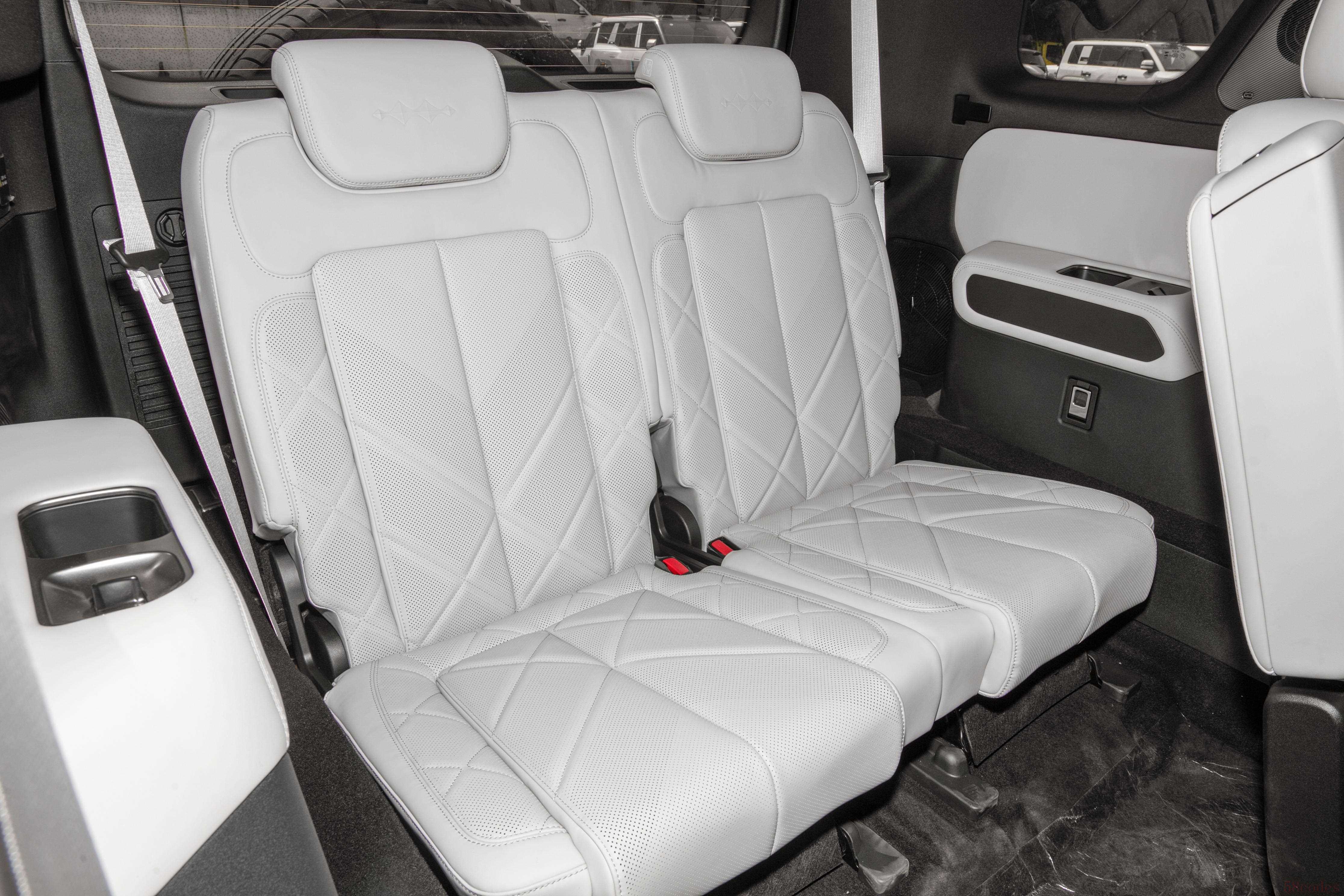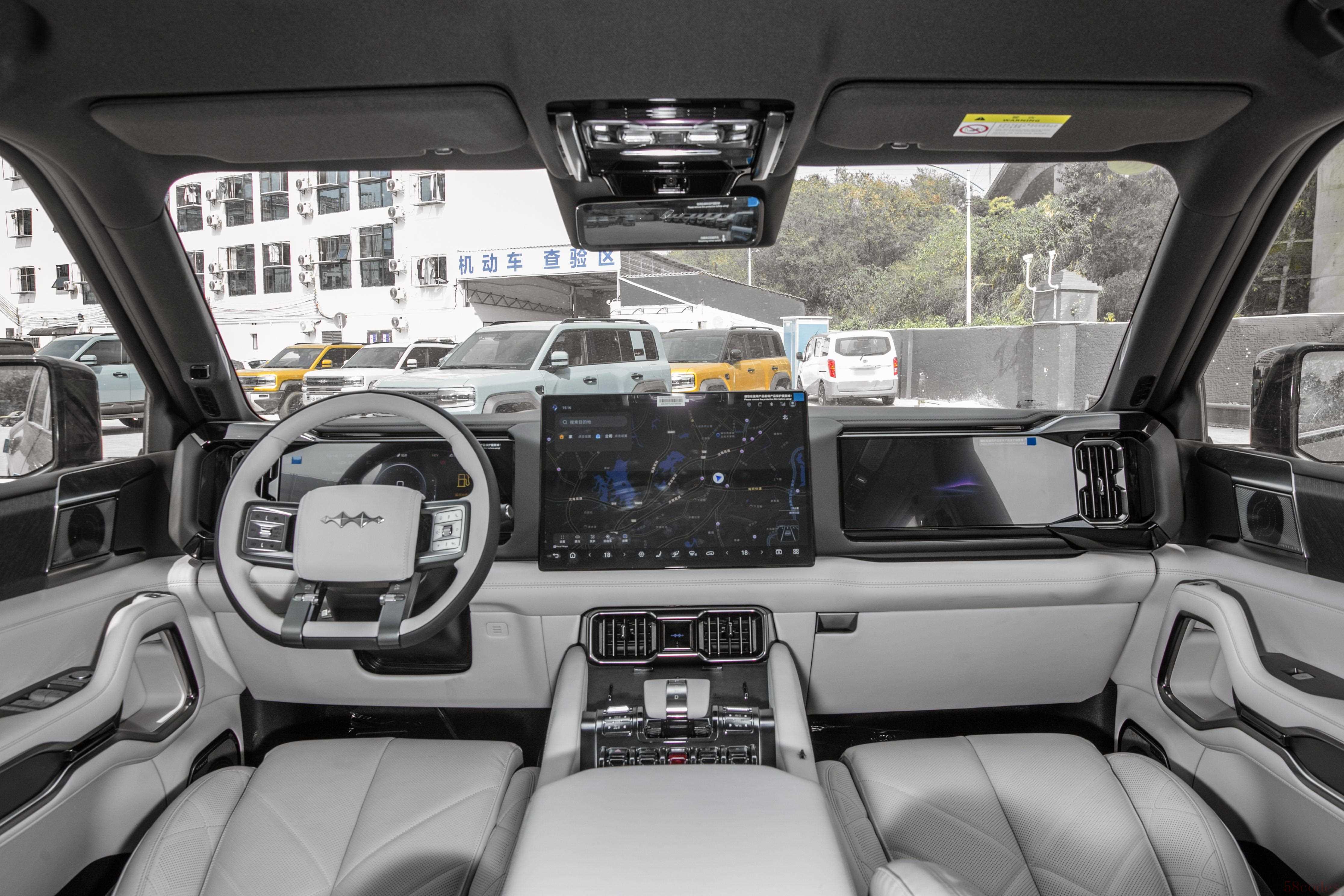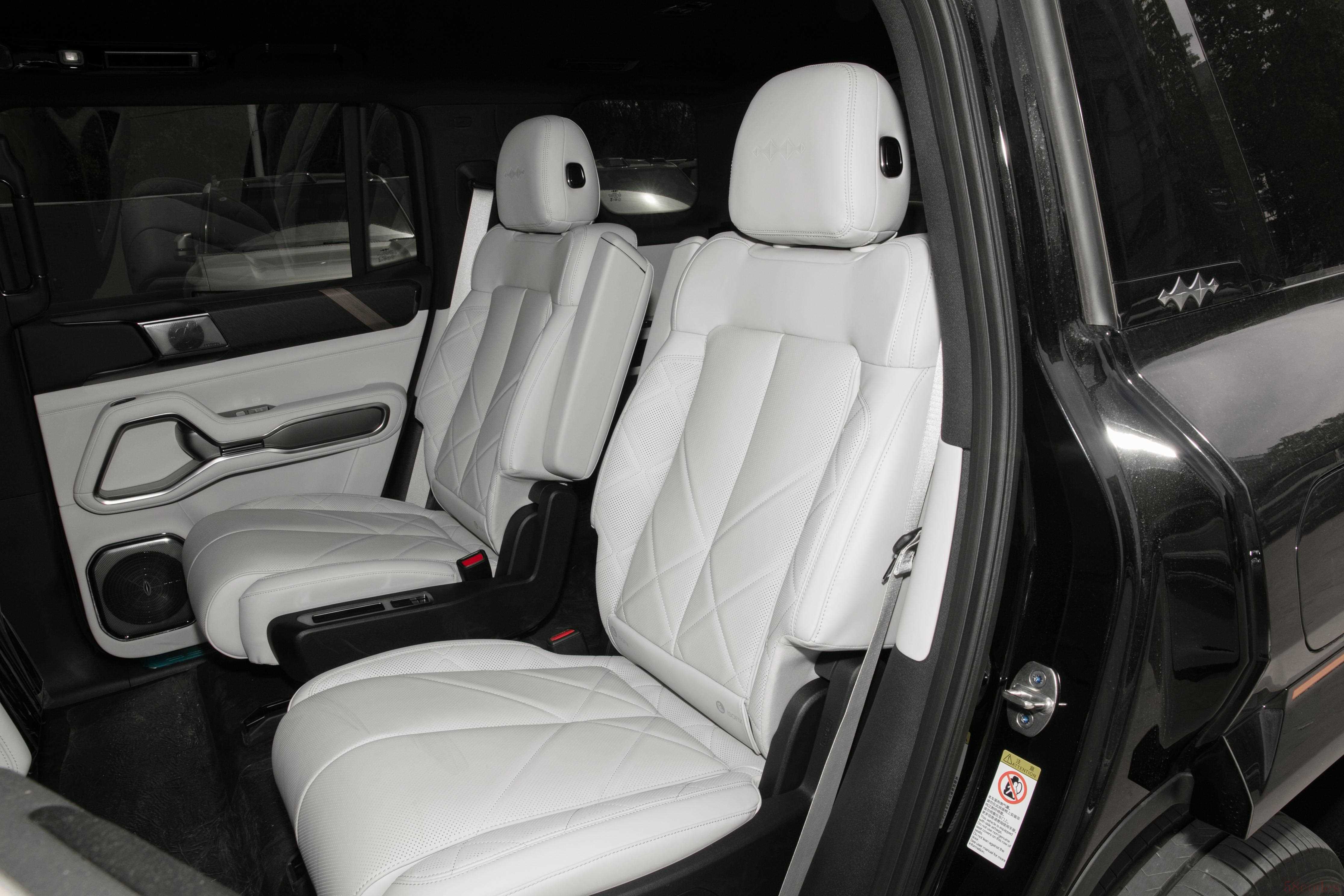 豹8车身长宽高:5195×1994×2002mm,轴距达2920mm,车顶无人机舱采用流线型设计,未压缩车内头部空间,第三排头部余量达950mm,成年男性乘坐无压迫感。座椅采用2+2+2布局,第二排独立座椅通道宽度优化至200mm,进出第三排更便捷,第三排座椅靠背支持10°角度微调,腿部空间可容纳身高175cm成人短途乘坐(膝部余量约一拳),但长途舒适性一般。