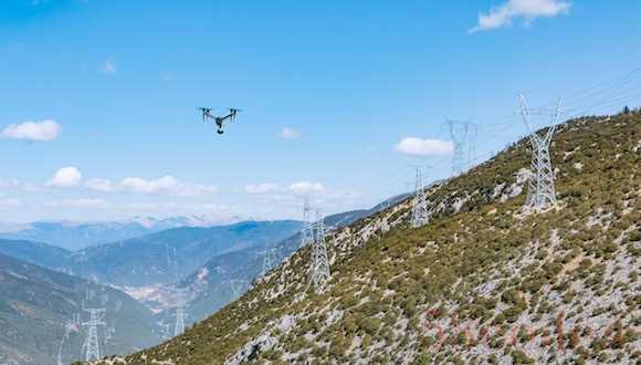 这不是极客爱好者的冒险飞行,而是大疆无人机正在进行电力巡线。