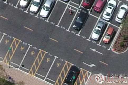 100%放大后酒店停车场地面上印刷的车位编号都可以依稀识别出来。