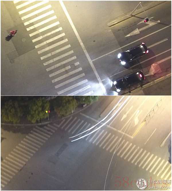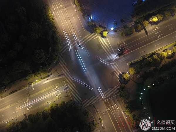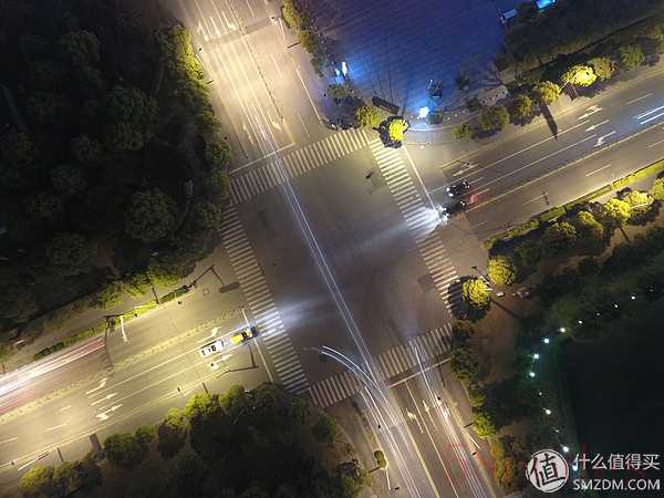 上半部分是6s照的100%截图,下半部分是8s照的100%截图。可以看出6s曝光下斑马线依旧清晰,8s时出现些许模糊,这证明了P4的云台可以很好地规避自身4个螺旋桨带来的震动以及高空气流带来的影响。