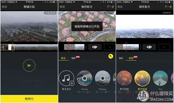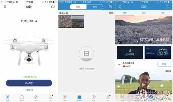 因为前面用iPad mini碰到了图传不稳定的问题,所以换回到iPhone 6s上来。APP主要有三个功能入口,第一个是飞行控制模式,第二个是航拍缓存到本地的视频和图片,第三个集合了全球大疆用户的精彩作品,十分值得学习和欣赏。