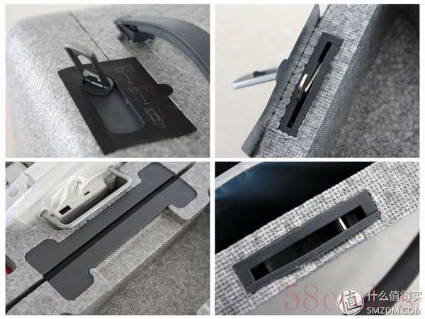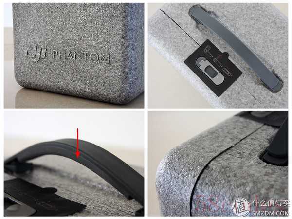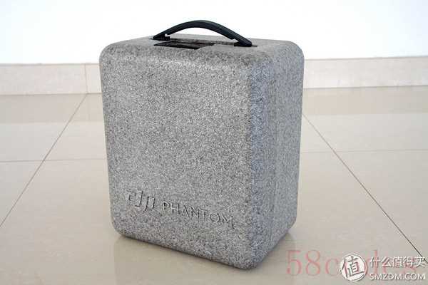 箱子的设计很用心,正面下方印着大疆精灵的英文字样,顶部有个旋转锁扣进行固定,拉起一拧就可以打开箱子,旋回一扣就可以锁紧固定了。提手内侧有软胶,长时间提着也不会勒手。箱子使用的是发泡材料,密度不低而且比较厚实,强度较高而且重量很轻。