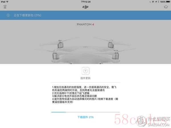 第一次使用就发现了固件更新,由于采用数据线连接,所以不用像P3S一样要在遥控和路由之间多次切换完成固件升级,直接点击升级就可以完成固件下载和遥控的固件升级,然后将手机与P4机身连接进行飞行器的固件升级。整个升级时间约半小时。
