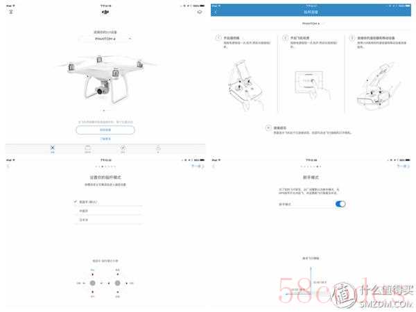 初始化过程与精灵3相同,遥控和飞机的电源先后打开,然后连接遥控和手机就行了,然后设定好摇杆模式,这里根据个人习惯选择,我使用的是美国手,也就是左摇杆负责上升下降和旋转,右摇杆负责前后左右移动。第一次用推荐打开新手模式,新手模式下飞行距离和参数都受限,等操作熟练后再关闭。