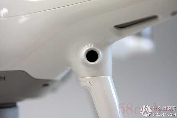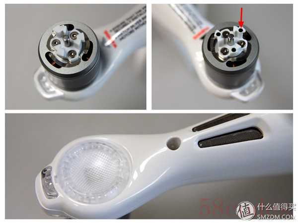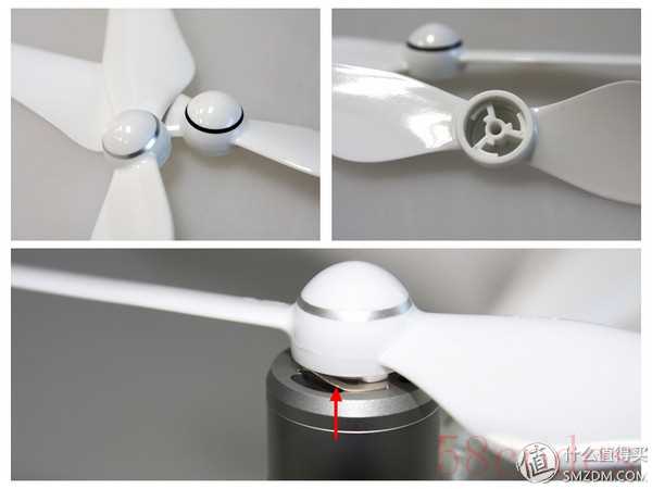 新桨叶对应新电机,之前在P3系列中用的是自紧式螺旋桨,需要手动拧紧,力度上有的时候不太好掌握,而P4采用快拆式螺旋桨,安装更加方便,放上一拧就好,拆下的时候按压并反向一拧就可取下,箭头所指的弹簧片起到了固定作用。个人觉得快拆桨是P4除了避障功能之外另一个重要的安全性改进,其锁定结构更加稳固,在转向和刹车时减少了射桨风险,要知道精灵3很多炸机都源于射桨,说到这里眼泪流下来,不要问我为什么