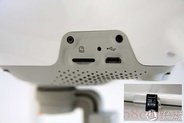 存储卡从摄像头移动到了机身处,旁边还有数据接口,在升级固件的时候就是用OTG线连接这个接口。P4随机附送了一张松下16G tf卡。可以存储约半小时的4K超清视频拍摄文件。建议再配一张32G或者更大容量的高速tf卡以备不时之需。