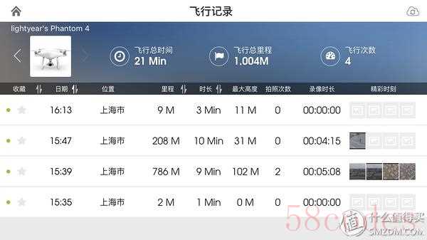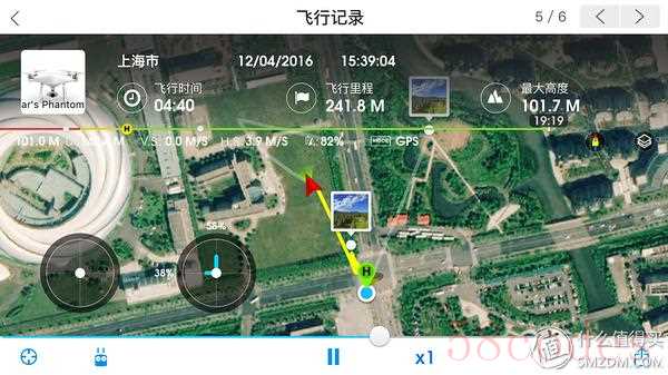 第一个功能区左上可以查看飞行记录,点击后可以实时回放飞行轨迹,甚至当时的飞行参数和摇杆操控情况也同步显示在手机屏幕上。