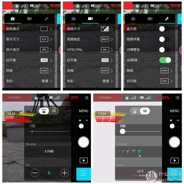 P4的相机设置菜单如上图所示,和普通的数码相机菜单差不多,而且还支持M档,用户可以手动设定ISO和快门时间等参数,曝光时间最长可以达到8秒,这对云台的稳定性要求很高。