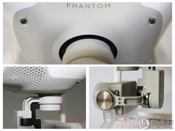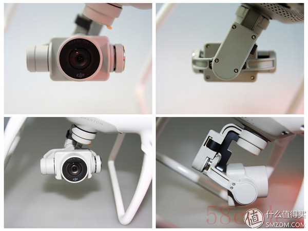 之前P3的云台悬挂减震球什么的已经全部藏在P4的机身内部了,所以配件中也不再附送这些。三轴云台可以实现俯仰、横滚和偏航三个方向的运动。可以发现外露的排线变得很少了,相对的故障率也会减少。