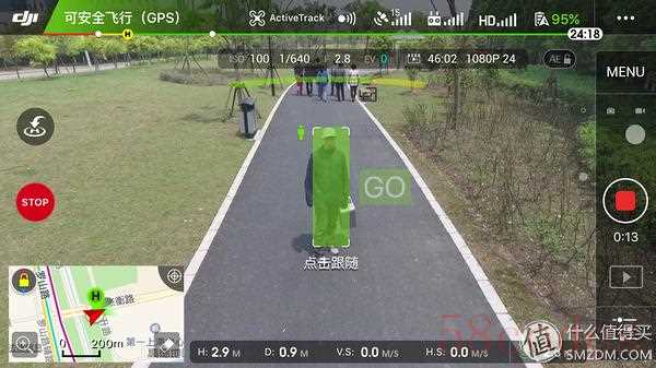 开启智能跟随功能后在画面中画出一个框圈选出需要被跟踪的物体,比如这里我找朋友当目标进行测试,绿框表示识别正常,点击GO就可以跟踪了。在跟踪时最好让被跟踪物体慢慢旋转一圈,P4会学习其整个特征,可以实现更好的跟随。下面用一段视频来演示一下跟踪的效果: