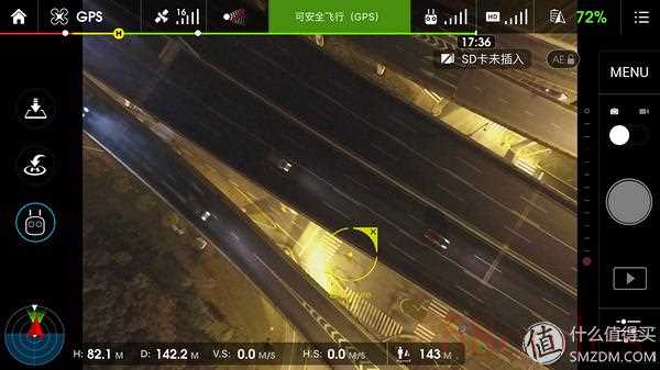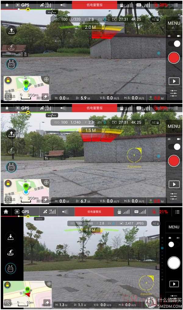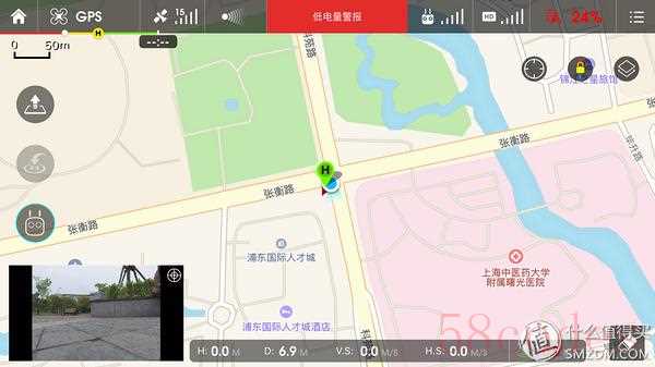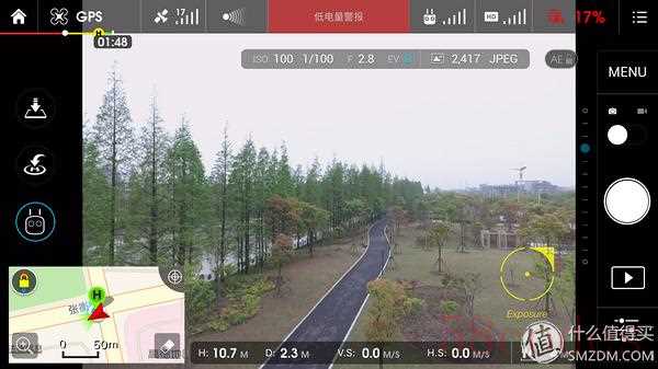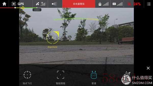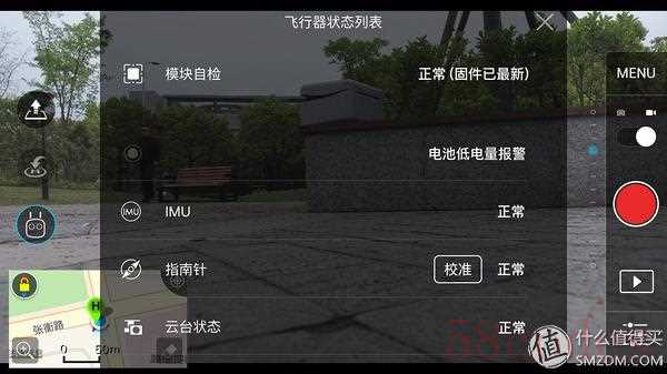 上图就是最重要的飞行界面了,顶部是状态栏,显示了飞行器、GPS、避障、遥控、图传、电池的状态,左侧是功能界面,实现降落、返航和智能控制,右侧是相机控制,左下是地图模式,下方是实时距离和速度。画面中的黄圈是测光点。可以说飞行时的很多操作需要在这个界面完成。