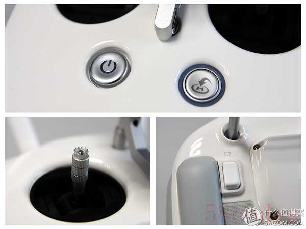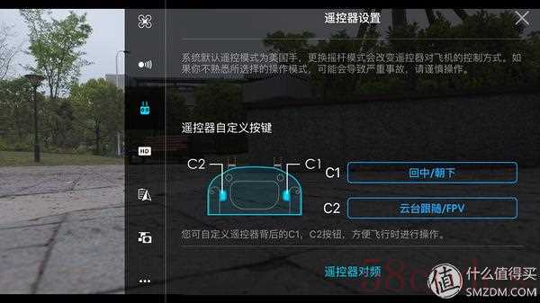电源键旁边是一键返航。摇杆可以调节高度。背面有C1和C2两个自定义功能键,可以设置两个常用的功能。