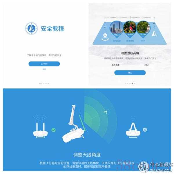 使用前APP会提示一段简短的安全教程,不过考虑到飞行器价格贵重而且一旦炸机有可能造成严重的人伤事故,强烈建议认真阅读完整说明书和官方教学视频,在该页面中还有相关问题解答,都看完之后会对P4有个完整的了解,不会像之前某几位哥们手忙脚乱航拍迪斯尼出糗。