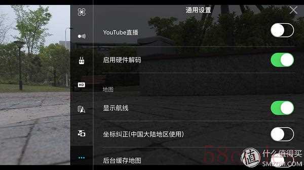 YouTube直播是个很好的功能,由于图像是通过数据线传到手机上的,不占用WiFi功能,所以手机可以再将实时图像分享出去,可惜国内无法访问YouTube。下方的坐标纠正也是国内环境特有的,建议打开,否则会出现航线在地图上明显跑偏的问题。