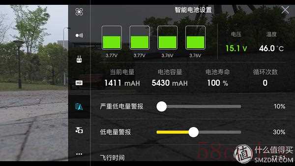智能电池的优势体现在这里,可以监控电压、温度和寿命等信息,如果出现异常就不要盲目飞行了。