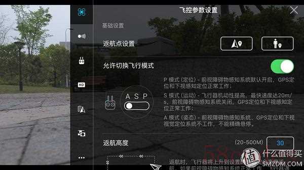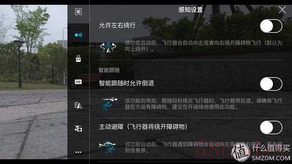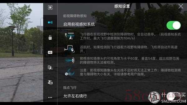 前视感知是个新增加的菜单项,这里需要注意的是前向避障对速度、可视角度和能见度都有要求,在不满足的情况下则无法启用,这个时候避障失效。再就是避障默认是从上方绕过,但是支持从两侧绕开障碍,不过因为P4只有前向避障,在左右移动或后退时一旦碰到树枝之类的障碍物就会炸机,所以不建议开启。