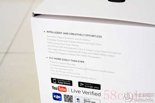 精灵4的包装箱和精灵3一样采用了白色,但是更加苗条,正面印刷的机身样貌半遮面,略带神秘感。包装侧面印有主要功能,其中障碍感知和躲避功能以及运动跟随功能是本篇评测要着重测试的部分。