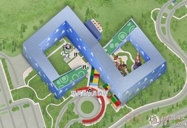迪士尼最有特色的官方酒店之一“玩具总动员酒店”,官方图上有巴斯光年、胡迪和火箭。
