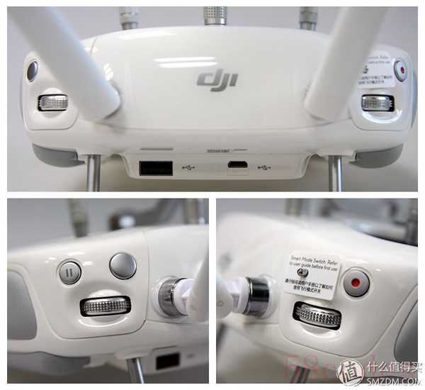 顶部的数据接口,其中那个标准USB口是连接手机数据线进行图传用的。右侧的拍照键和暂停键以及相机模式切换拨轮,这个拨轮可以按下。左侧是摄像键、云台俯仰拨轮和模式切换杆。