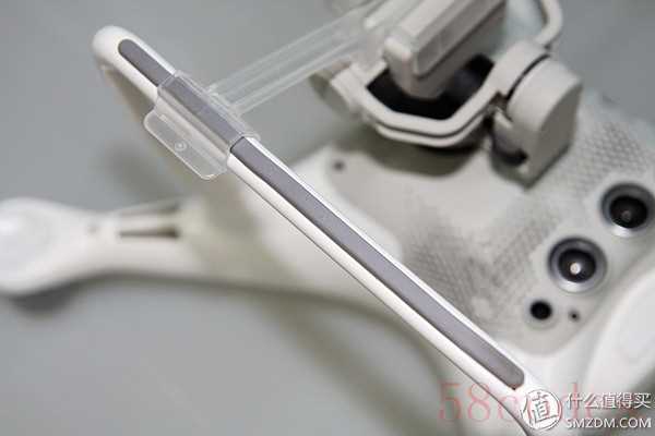 脚架部分也是一个变化比较大的地方,感觉硬度更高,减震部件也从P3系列的两小块减震海绵升级成了减震胶条,效果更好而且更耐用。云台固定卡子也变了,之前是单独卡住云台,现在由于云台结构改变使得之前的固定方式不再适用,于是新的固定卡子借助两侧脚架对云台进行固定。开机通电前务必将其取下,关机后记得将其重新装回。