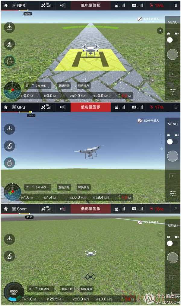 说完监控画面,再来看看APP中一个十分有用的功能--模拟飞行。这个功能让新手在实际飞行前熟悉遥控和手机触摸操作。在我第一次用P3S的时候模拟飞行还只支持iOS版的APP,现在安卓版本也可以实现模拟飞行了。
