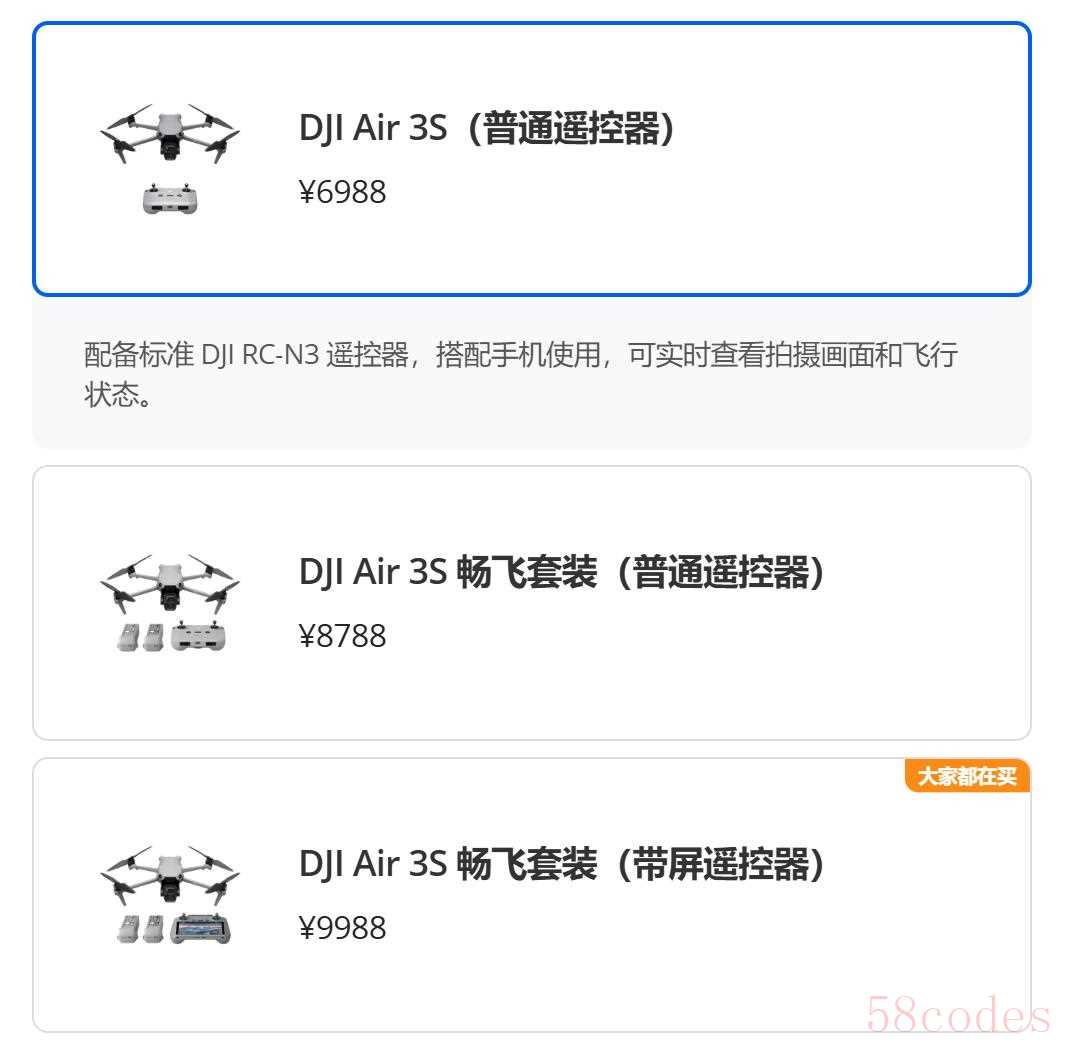 大疆创新 Air 3S自发布之日起即可购买,有三种不同的配置。