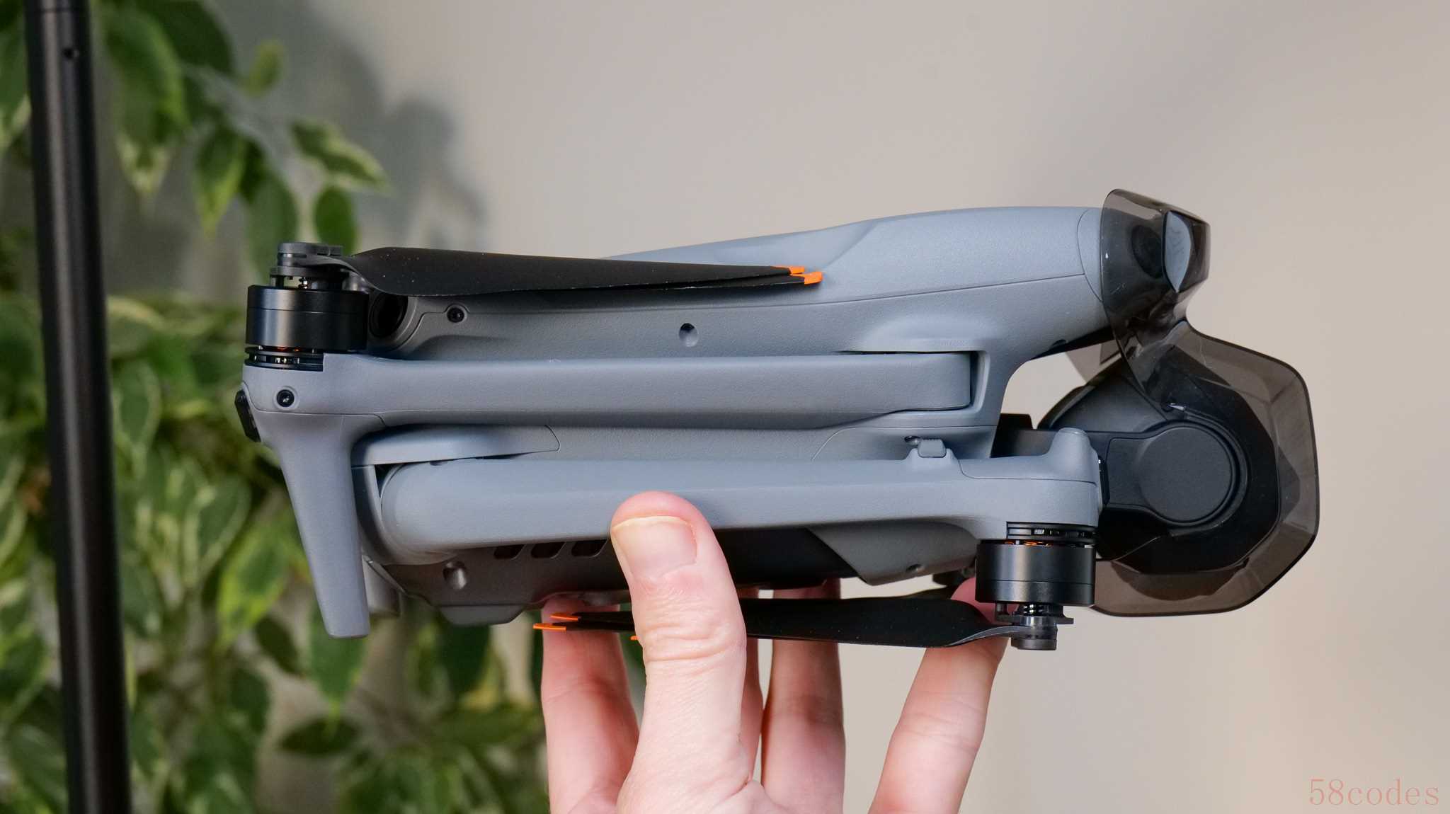 Air 3S 采用折叠式设计,一个块状的主体,机头装有云台相机,机身后部有放置电池的空间,另外还有四个折叠臂,用于固定电机和转子,使无人机保持在空中飞行。完全折叠后可以装在一个小包里随身携带。如果要携带控制器和备用电池等额外设备,可能会需要一个空间更大、保护性更强的包里。
