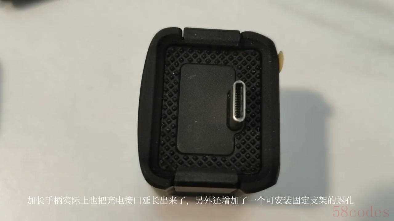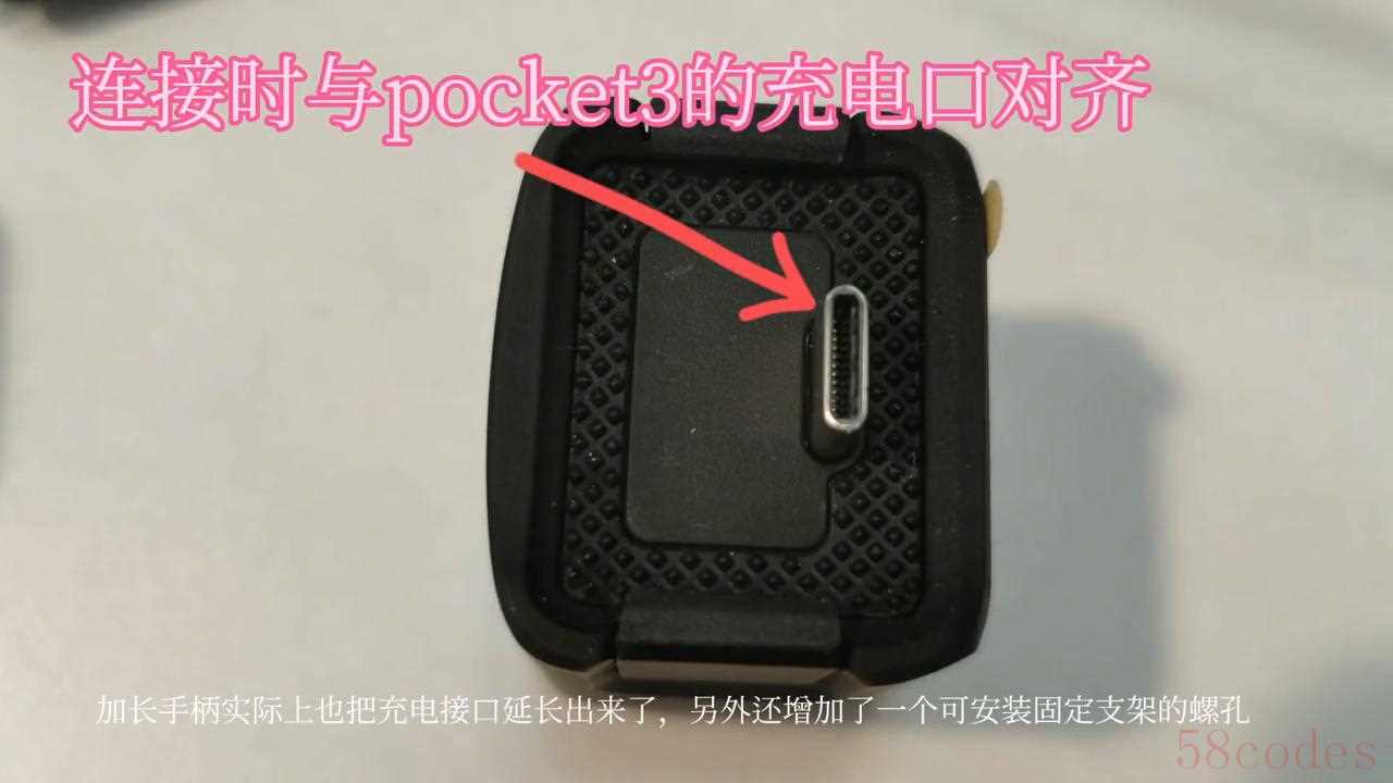 加长手柄实际上也把充电接口延长出来了,另外还增加了一个可安装固定支架的螺孔,可以通过螺孔把pocket3安装在三脚架上,方便固定拍摄。这是加长手柄与pocket3之间的连接卡扣,连接时对准充电口往里推,听到卡扣清脆的声音即可。取下来只需要按住这个键往外拉出即可。