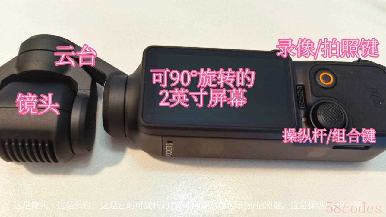 这是pocket3的充电口,如果与加长手柄连接后,也可以通过加长手柄的充电口充电。这是镜头,这是云台,这是它的可旋转的2英寸屏幕,这是录像/拍照键,这是操纵杆/组合键,这是录音孔,这是防滑脱安全绳,调节这里可以调节拴在手臂上的松紧度。