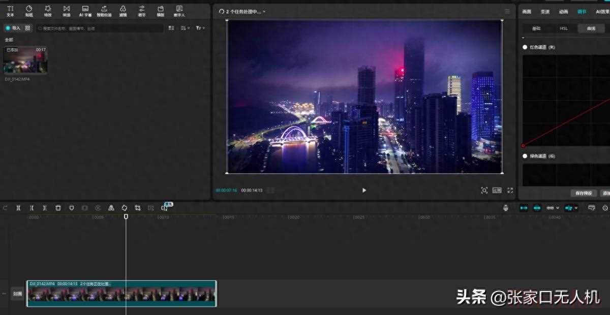 - 阴影加蓝:打开「调节」面板里的「曲线」工具,找到蓝色通道,把左下角的锚点往上提,这样就能给视频的暗部加上冷色调,让夜景更有氛围感。