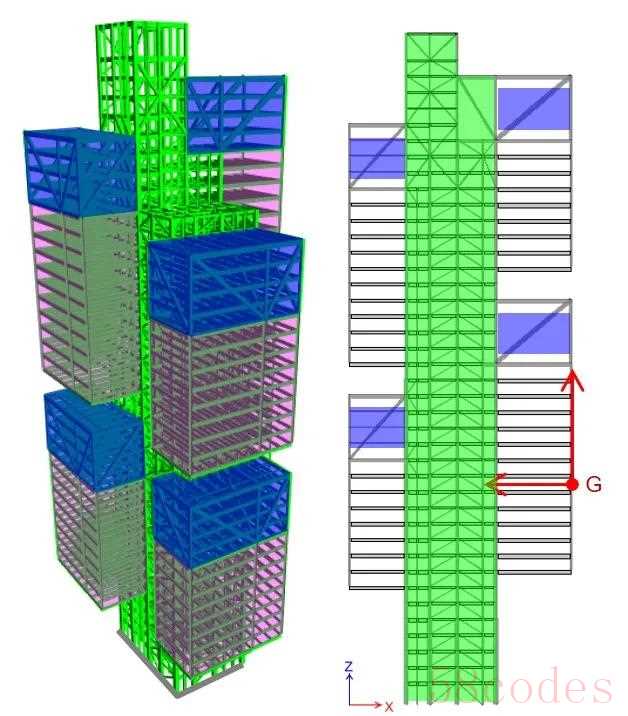 如此独特的不对称悬挂结构和仅靠核心筒落地支撑整栋大楼的竖向传力和抗震抗风的设计方案,给天空之城的总体抗震设计带来了巨大的挑战。