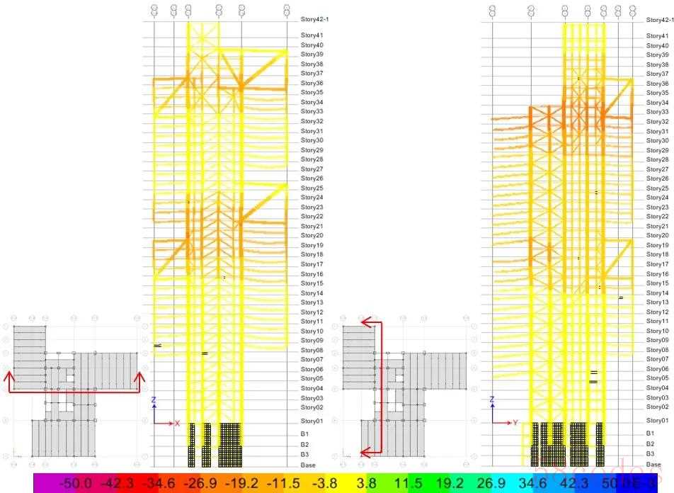 天空之城的核心筒区域是仅有的落地构件,将作为主要的抗侧向力构件,需要有能力承担所有的侧向力;悬挂的箱体结构和吊柱对于确保悬挂楼层的安全性也至关重要。我们的团队根据这些结构特点,以及局部环境和结构需求等情况,将塔楼结构的抗震性目标定为C+。在通过一系列方案分析论证结构安全性满足要求后,团队更进一步通过放大地震加速度的超大震分析,使结构发生明显的塑性开展直至倒塌,找出结构薄弱部位、破坏机制,以及结构抵抗超大震的安全储备,据此加强并完善抗震设计。
