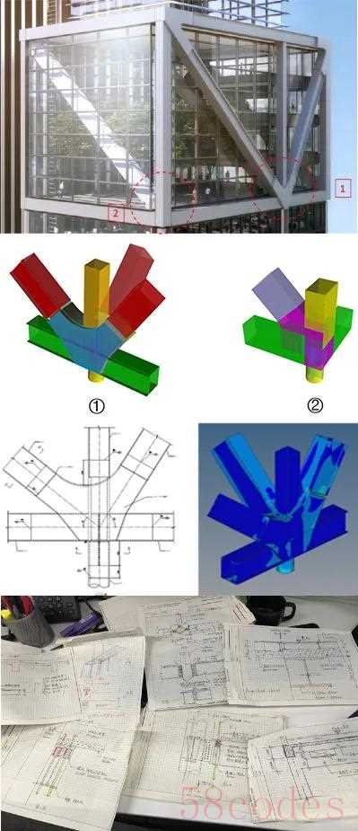 天空之城大厦浓浓的工业技术风格不仅仅是通过整体建筑的造型来体现,而且大量采用了外露的结构来表现建筑之美和高级的技术感,我们的结构工程师、建筑师,和业主对于需要结构表现的外露构件设计和节点设计进行了大量的设计配合和探讨,高效的手绘沟通,辅以3D/BIM的建模推敲和分析设计,从而实现了外露结构的美观、安全,和施工可行性。
