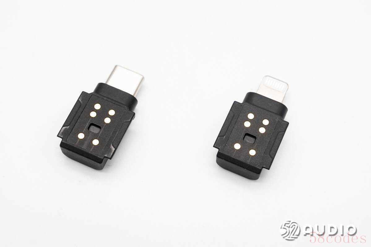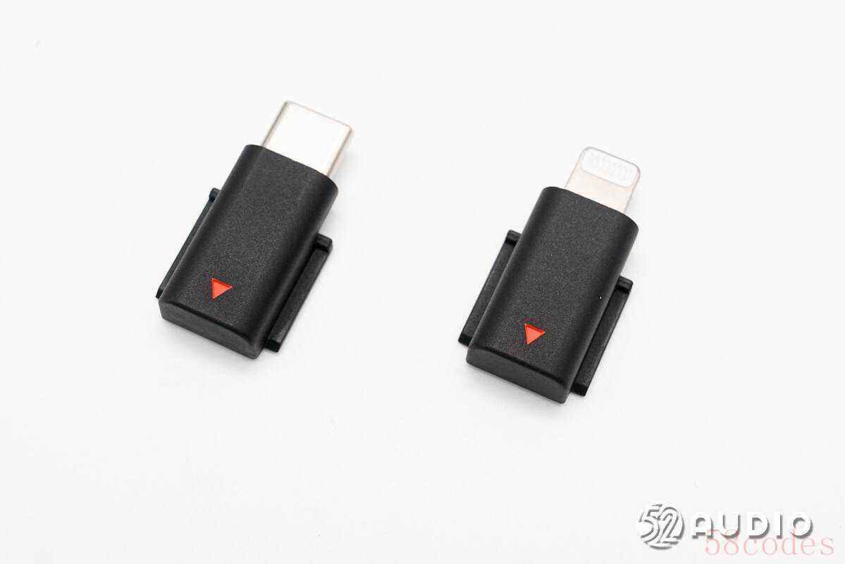 随机标配的USB-C和Lightning接收器连接头,模块化设计,卡扣固定,用于连接对应接口的手机、平板等录音设备。