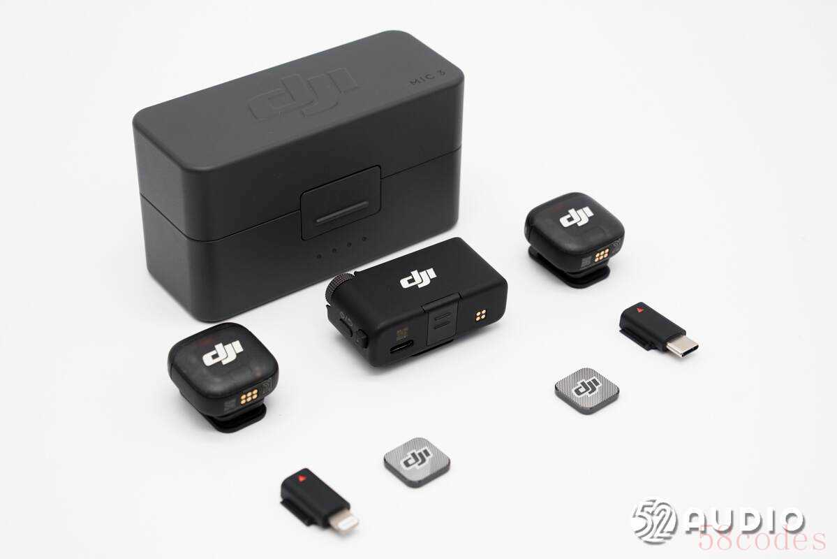 打开包装盒,取出内部所有物品,包括了接收器、发射器x2、充电盒、收纳袋、磁铁x2、手机连接头、防风毛套x4、相机连接线、USB-C数据线、磁吸背夹x2,以及及产品说明书等文档。
