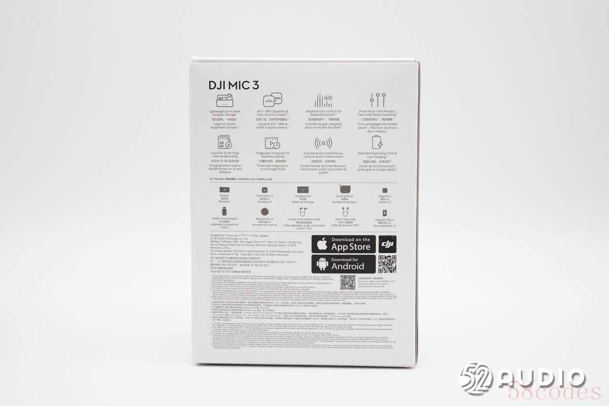 大疆DJI Mic 3无线麦克风包装盒延续了家族式的设计,此次拆解的为「一拖二带充电盒」版本,正面展示有产品的整体外观,品牌LOGO和产品名称。