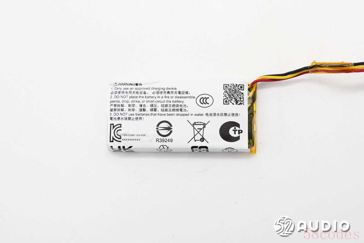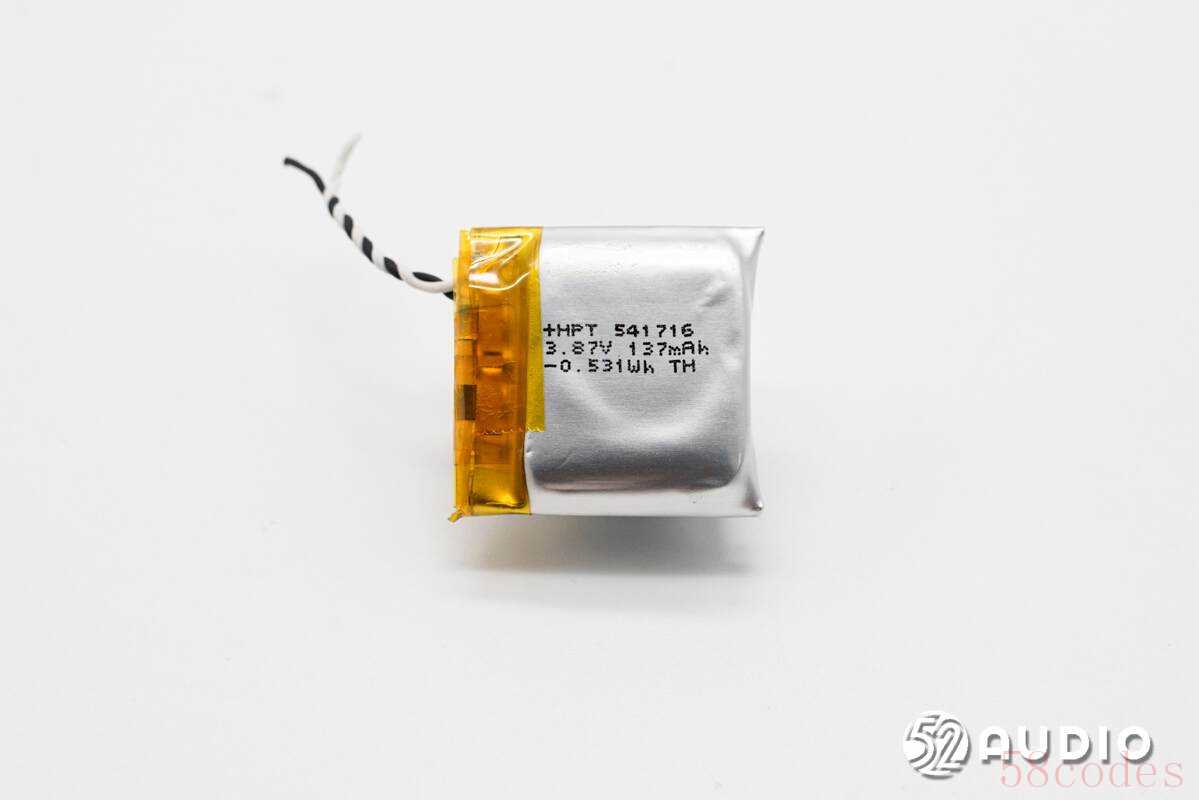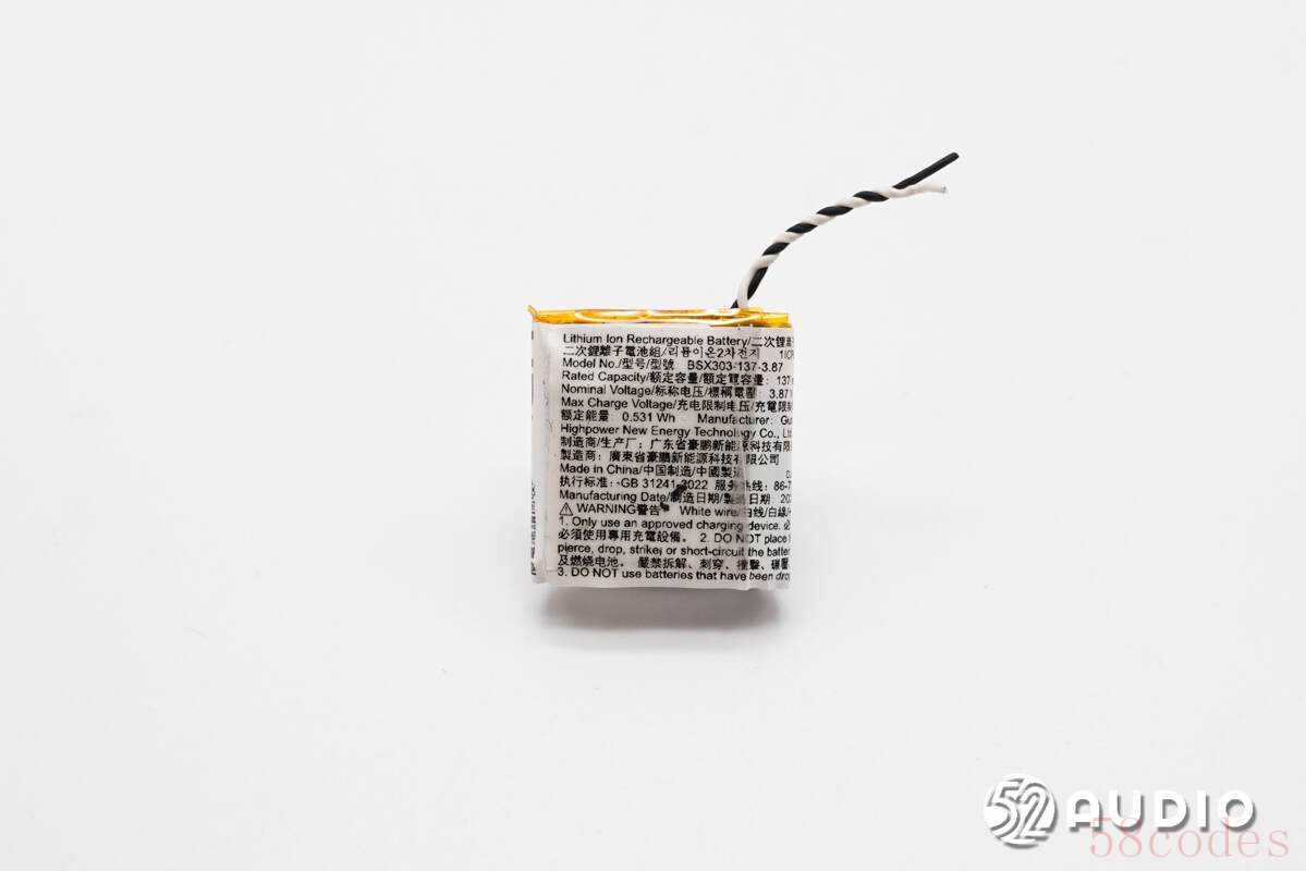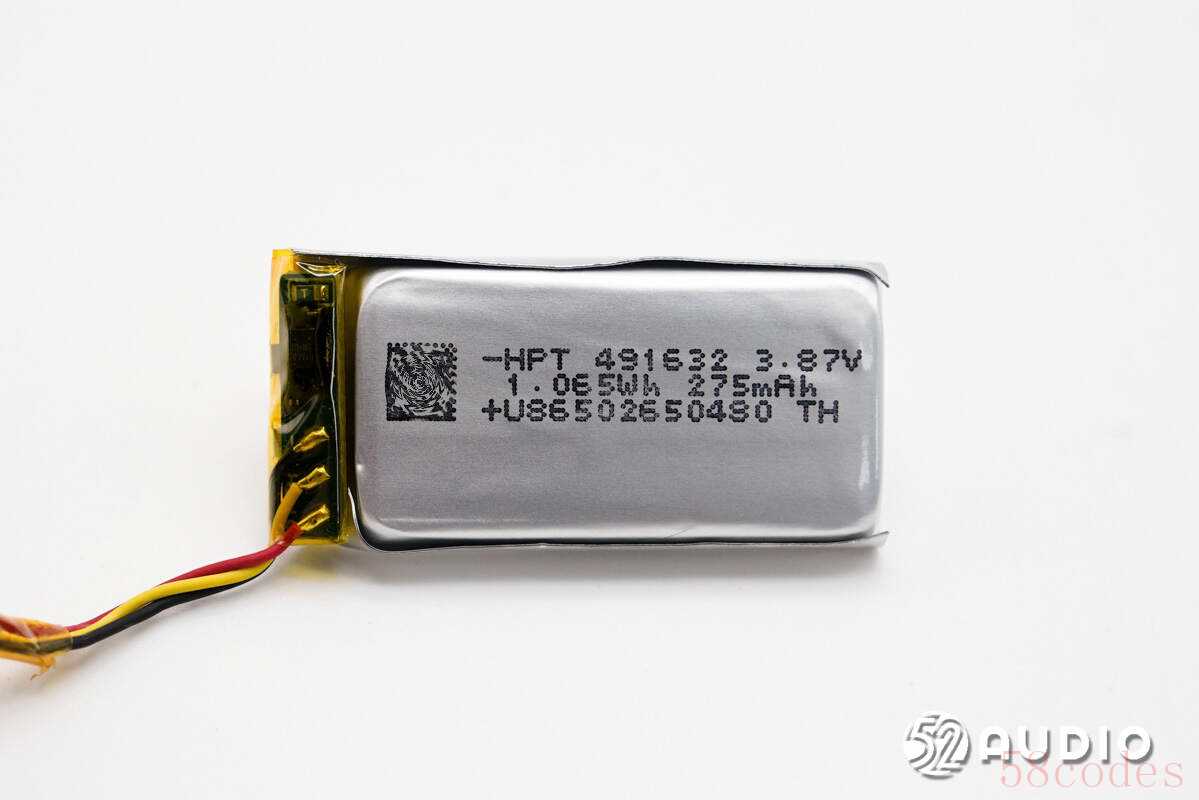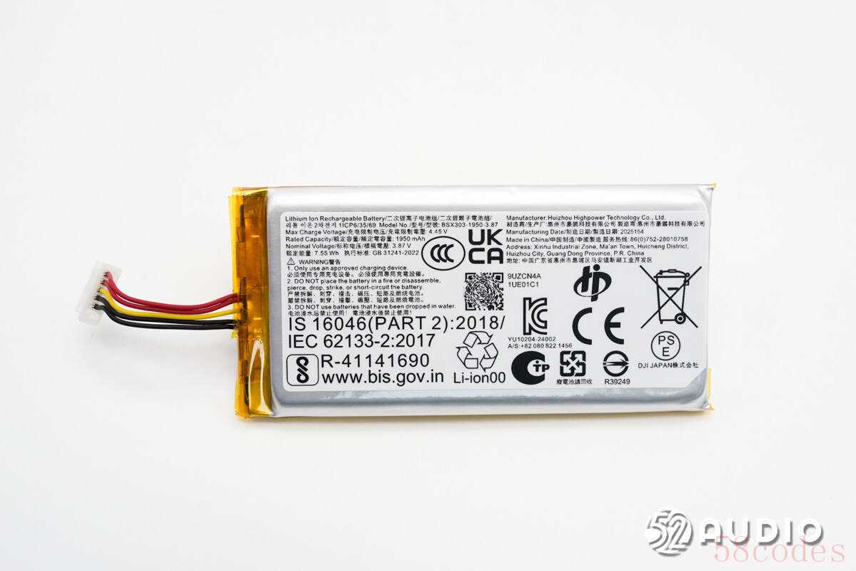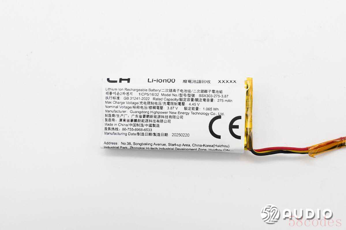 接收器内置二次锂离子电池组,型号:BSX303-275-3.87,额定容量:275mAh,充电限制电压:4.45V,标称电压:3.87V,额定能量:1.065Wh,制造商:广东省豪鹏新能源科技有限公司。