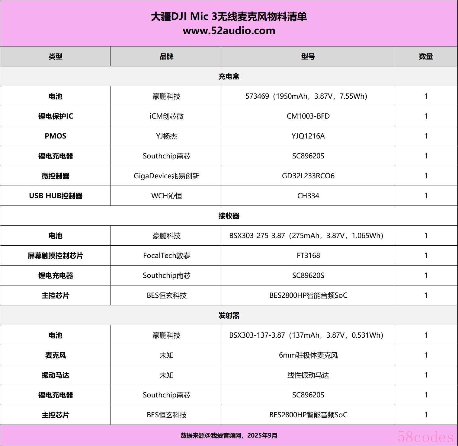 最后附上大疆DJI Mic 3无线麦克风的已知核心器件清单,方便大家查阅。