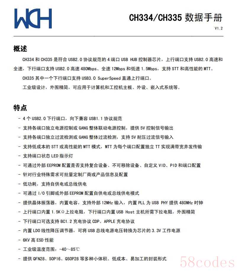WCH沁恒CH334符合USB2.0协议规范的4端口USB HUB控制器芯片,上行端口支持USB2.0高速和全速,下行端口支持USB2.0高速480Mbps、全速12Mbps和低速1.5Mbps,支持STT和高性能的MTT。