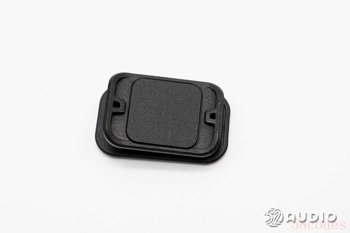 磁吸背夹内侧结构特写,中间方形磁铁,两侧设置有定位柱结构,防止背夹与发射器固定时转圈。