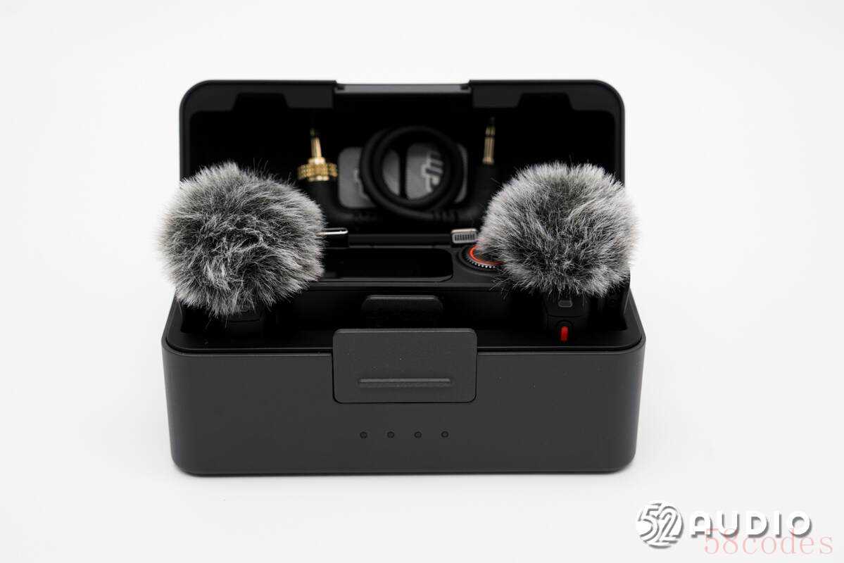 打开充电盒盖,内部可完整收纳麦克风、连接头,以及防风毛套、数据线、磁铁等配件,外出使用更加便携。