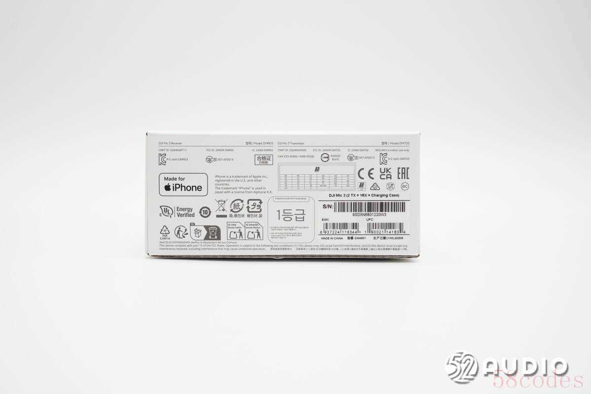 包装盒底部设计有各种认证标识和监管信息,贴有产品出厂标签,发射器型号:DMR03,接收器型号:DMT03。