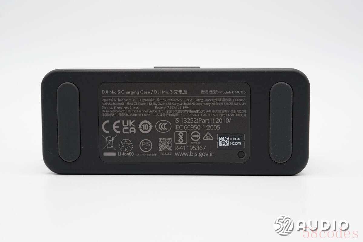 机身底部设置有防滑橡胶垫,标注有产品信息。DJI Mic 3充电盒,型号:DMC03,输入:5V-3A,输出:5V-0.42A*2+0.83A,额定电容量:1300mAh,深圳市大疆灵眸科技有限公司,中国制造。