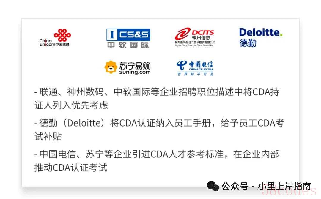 CDA企业认可度如何?CDA企业认可度非常高,很多企业招聘时注明CDA数据分析师优先,对找工作非常有帮助。很多银行、金融机构的技术岗会要求必须是CDA数据分析师二级以上的持证人。中国联通、央视广信、德勤、苏宁等企业,把CDA持证人列入优先考虑或者对员工的CDA考试给补贴。