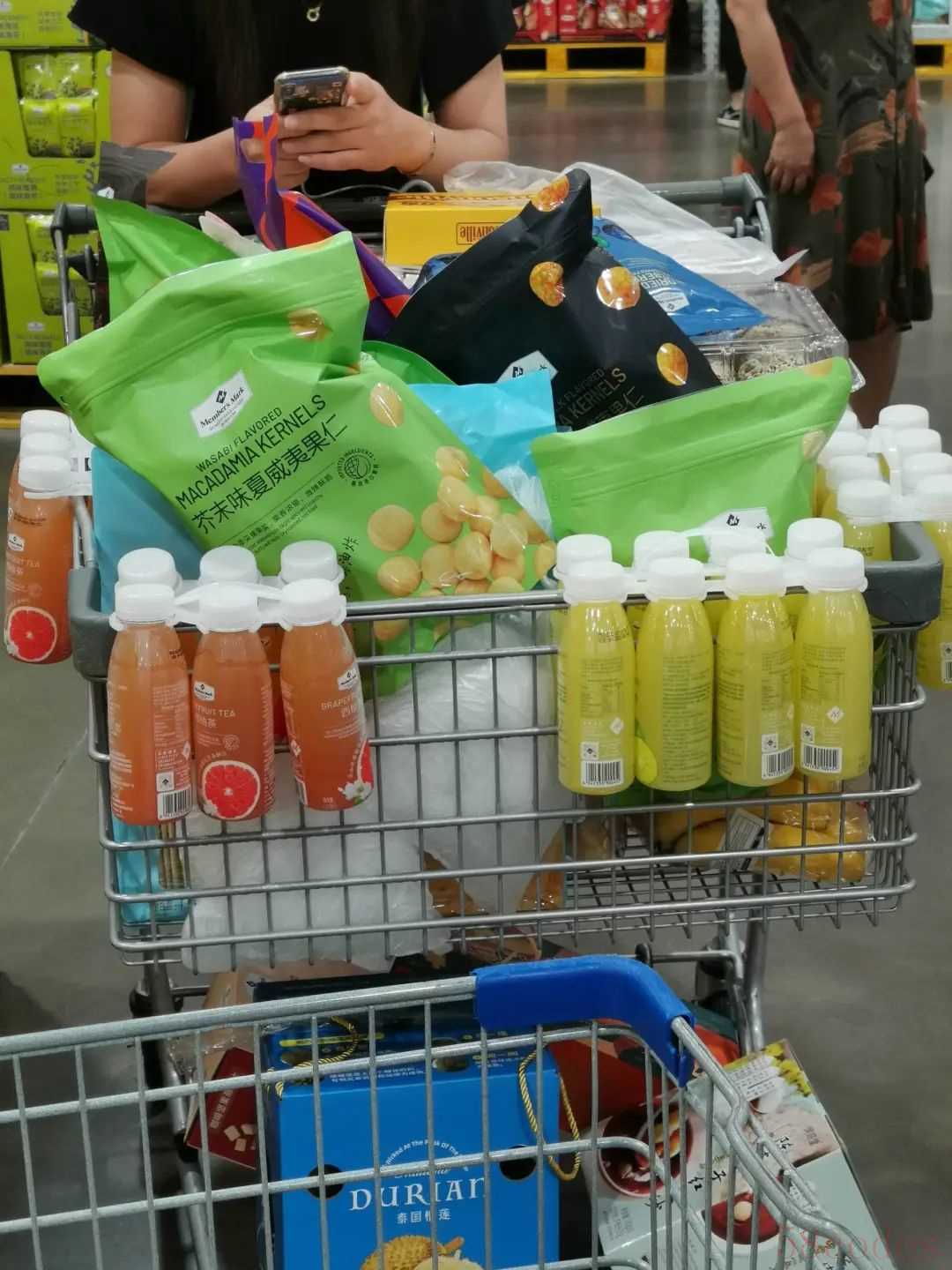购物车上挂着热销的山姆自有品牌小青柠汁和西柚茶