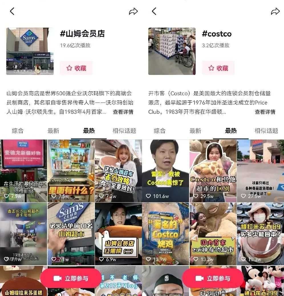 从社交平台的整体声量来看,“山姆会员店”和“costco”相关话题在抖音分别获得19.6亿和3.2亿次播放,热门视频类型包括美食测评、逛超市vlog、购物攻略等。