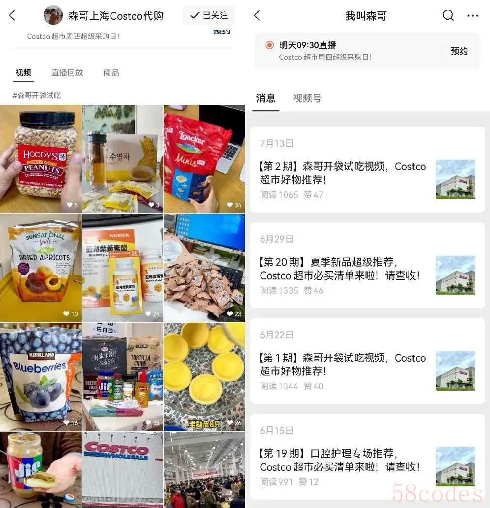 关注“森哥上海Costco代购”后,每周二、周四、周日我都会收到他视频号开播的弹窗通知。平时森哥会在公众号定期发文推荐新品和主题清单,朋友圈和群内同步转发并提醒大家预约直播。由于超市现场直播无法打开包装展示,视频号还会发布视频如美食试吃作为补充。