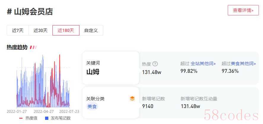 据新红数据,近半年内,“山姆会员店”在小红书的热度超过平台其他99.82%的热搜词。值得回购的好物分享、疫情囤货抄作业、超市供应商同款美食等笔记互动量较高。